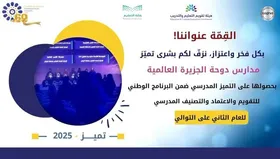 كريم مدارس دوحة الجزيرة العالمية في المرحلتين المتوسطة والثانوية في الملتقى الوطني للتميز المدرسي ( تميز 2024) الذي تنظمه هيئة تقويم التعليم والتدريب بالتعاون مع وزارة التعليم وفقاً لنتائج التقويم الخارجي.